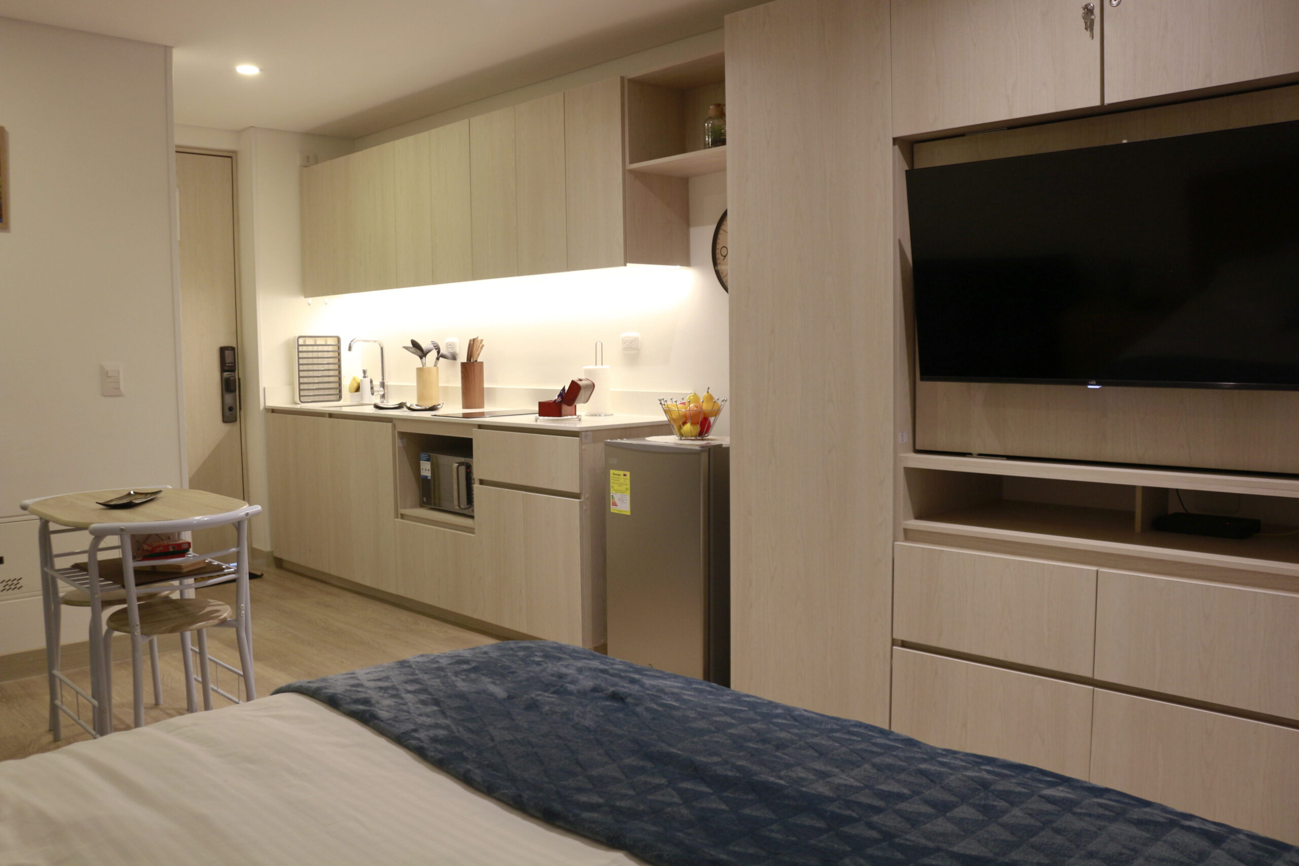 - Servicios Agua Caliente, Almohadas y mantas adicionales, Ascensor, BotiquÃn de primeros auxilios, Café, Cafetera, Chapa Digital con teclado, Cocina, Compactador de basura, Congelador, Copas de vino, Detector de humo, Espacio para guardar la ropa, Extintor de incendios, Ganchos para la ropa, Licuadora, Limpieza disponible durante la estadÃa (Costo adicional), Llegada autónoma, Microondas, Parqueadero bajo disponibilidad, Persianas o cortinas opacas, Plancha, Platos y cubiertos, Refrigerador, Sábanas, Secadora de pelo, Servicio de limpieza: disponible por un costo adicional, TV, Utensilios básicos para cocinar, wifi, Zona de trabajo